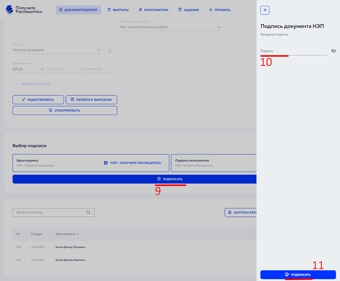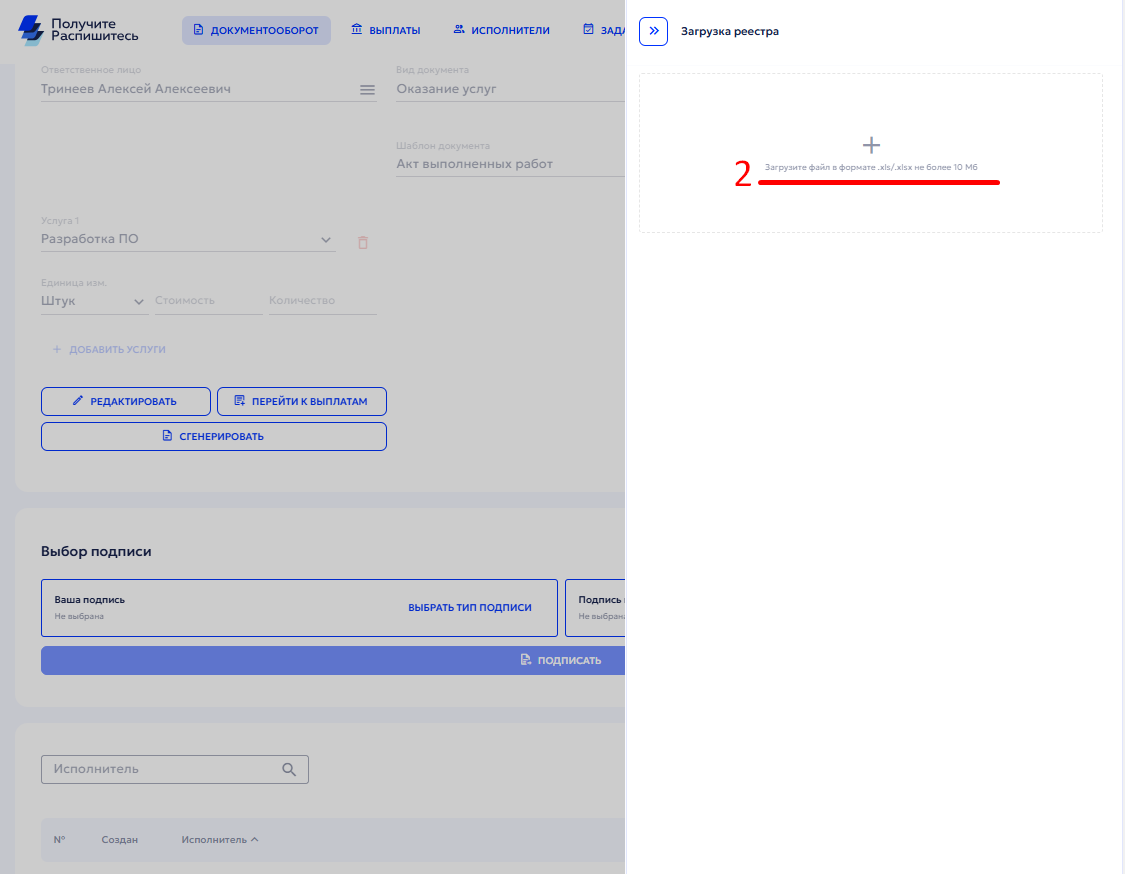 Если появится ошибка, при выборе типа подписи исполнителя, то у одного из исполнителей в реестре отсутствует электронная подпись НЭП. В таком случае требуется связаться с исполнителем, оповестить о необходимости создания НЭП, далее повторить выбор типа подписи.