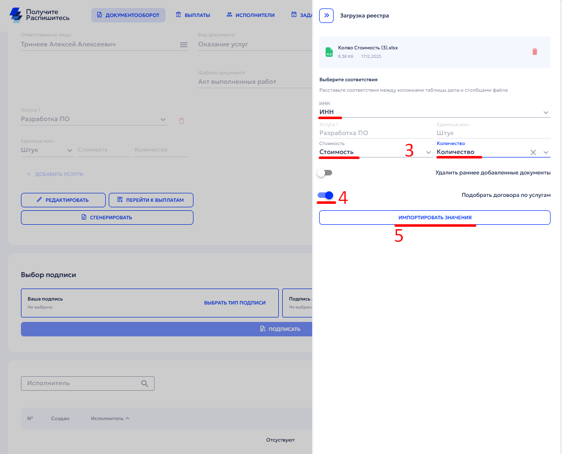 3. Выполните сопоставление полей: нажмите на каждую строку и свяжите наименования полей с соответствующими столбцами реестра