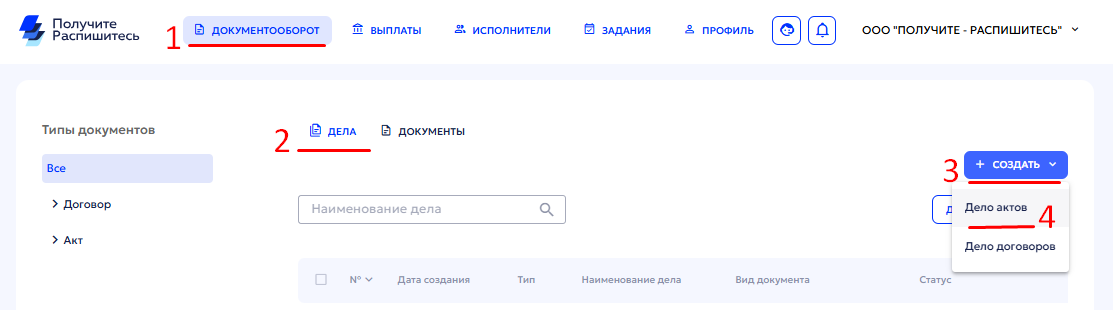 - Выберите тип «Дело актов»