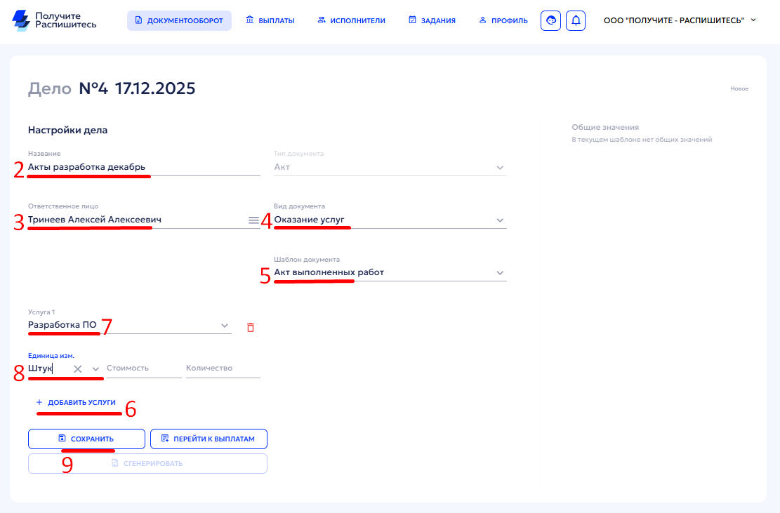 - Укажите название дела — «Дело актов»