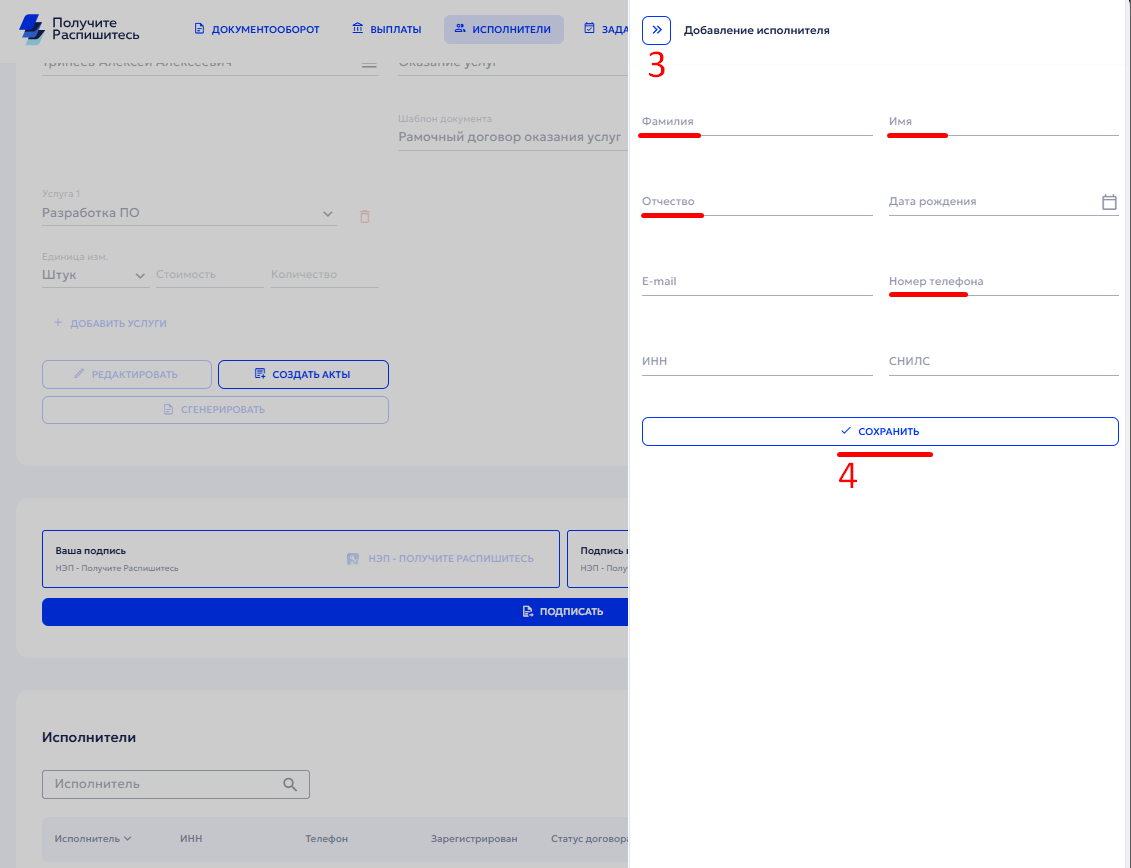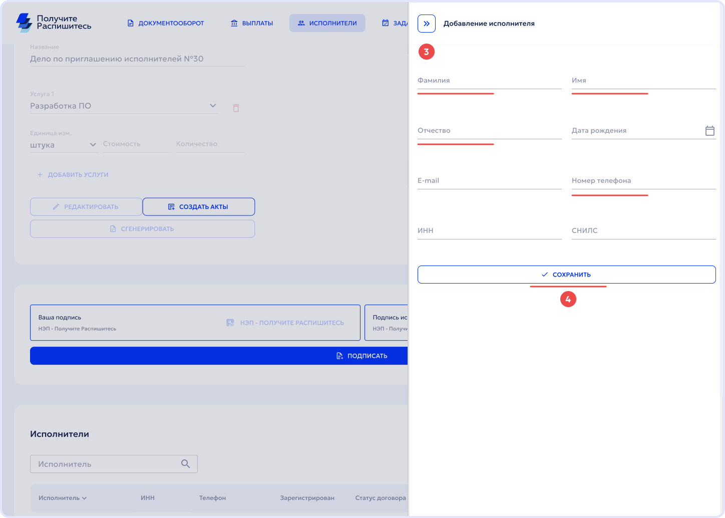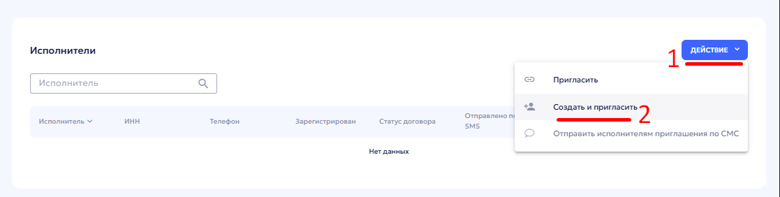 Этот способ подходит в случаях, когда данные исполнителя ещё не добавлены в личный кабинет, и вы хотите сразу пригласить его на платформу и на подписание договора.