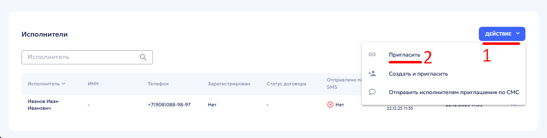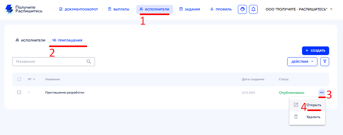 Порядок создания приглашения подробно описан в отдельной статье базы знаний. Ниже приведена инструкция по добавлению нового исполнителя в существующие приглашение.