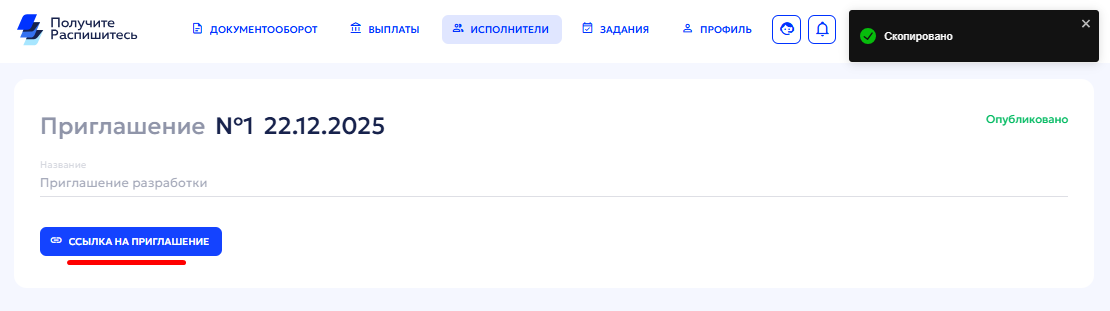 Скопируйте ссылку в левой верхней части экрана, нажав кнопку «Ссылка на приглашение», и передайте её исполнителю. После прохождения регистрации исполнитель автоматически отобразится внутри приглашения.