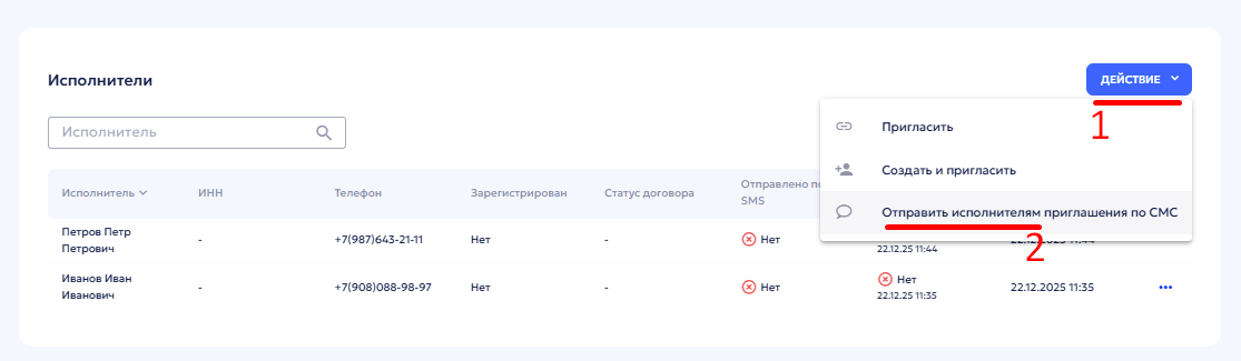 После того как исполнители появятся в списке, отправьте им приглашение с помощью СМС: