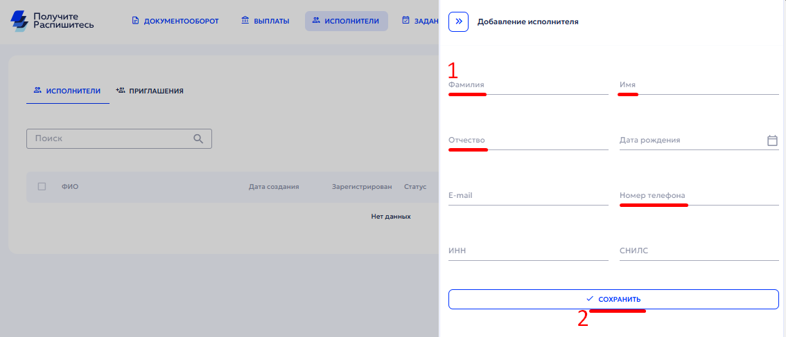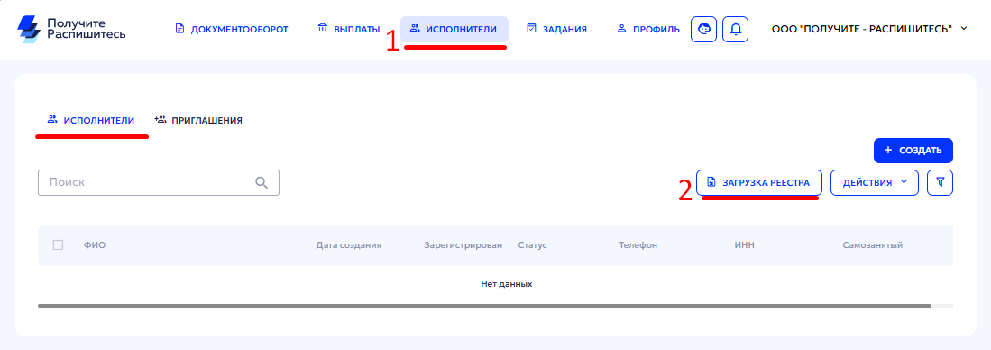 Для создания выплат, заданий и ведения электронного документооборота с исполнителями, сотрудничающими с вашей компанией, необходимо предварительно добавить их данные в личный кабинет организации.