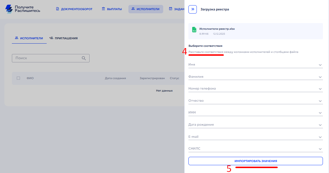 Предварительно подготовьте реестр в формате Excel с четырьмя колонками:
