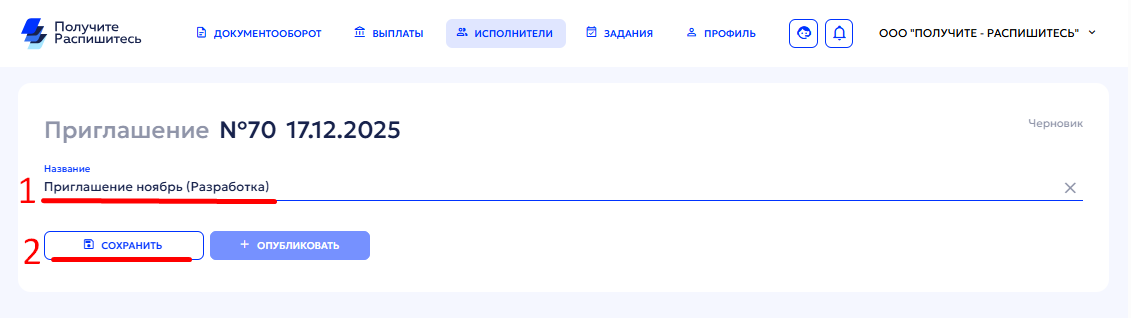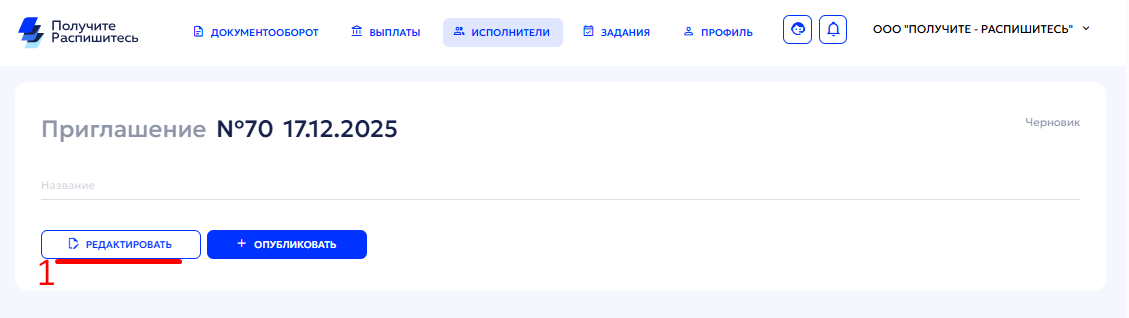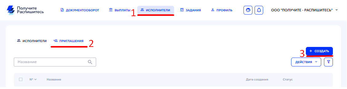 Вкладка «Приглашения» позволяет массово или по одному приглашать исполнителей к регистрации на платформе и подписанию договора для начала работы.