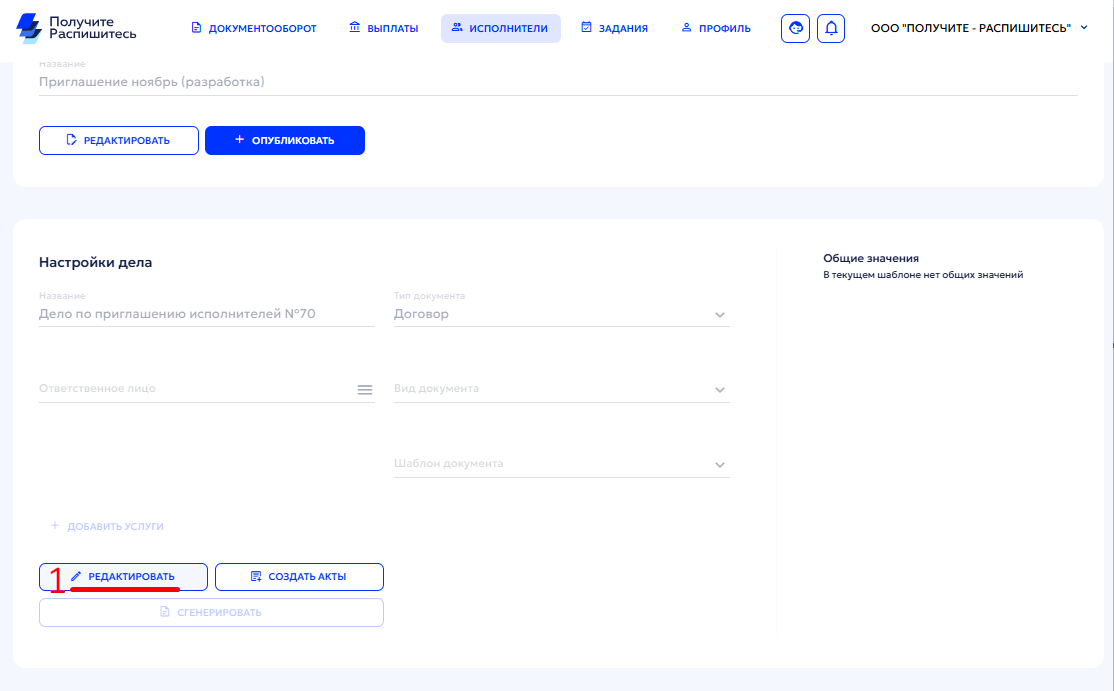 - Если вы используете индивидуальный шаблон договора с дополнительными полями исполнителя (например, дата рождения, СНИЛС и другие персональные данные), подписание договора через раздел «Приглашения» недоступно