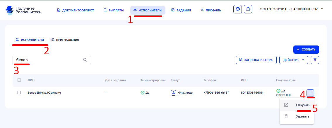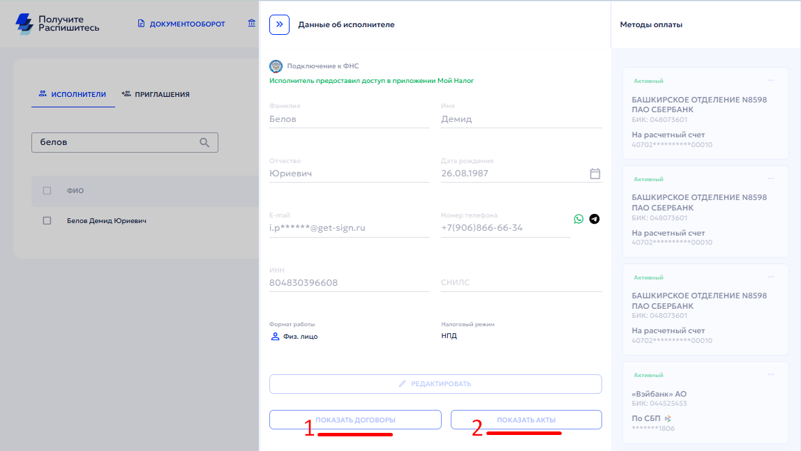 Таким образом, вы можете находить исполнителей и просматривать все связанные с ними документы — договоры и акты, а также контролировать статус электронного документооборота по каждому исполнителю.
