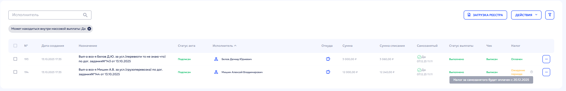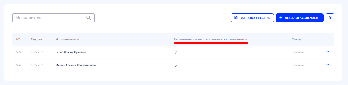 Если перейти в «Дело актов» по данной выплате, в колонке «Автоматически выплатить налог за самозанятого» будет отображено, для каких исполнителей включена уплата налога в соответствии с данными вашего реестра.