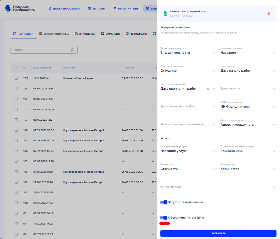 Ниже по странице загрузите реестр стандартным образом, сопоставив наименования строк с соответствующими наименованиями колонок из выпадающего списка.