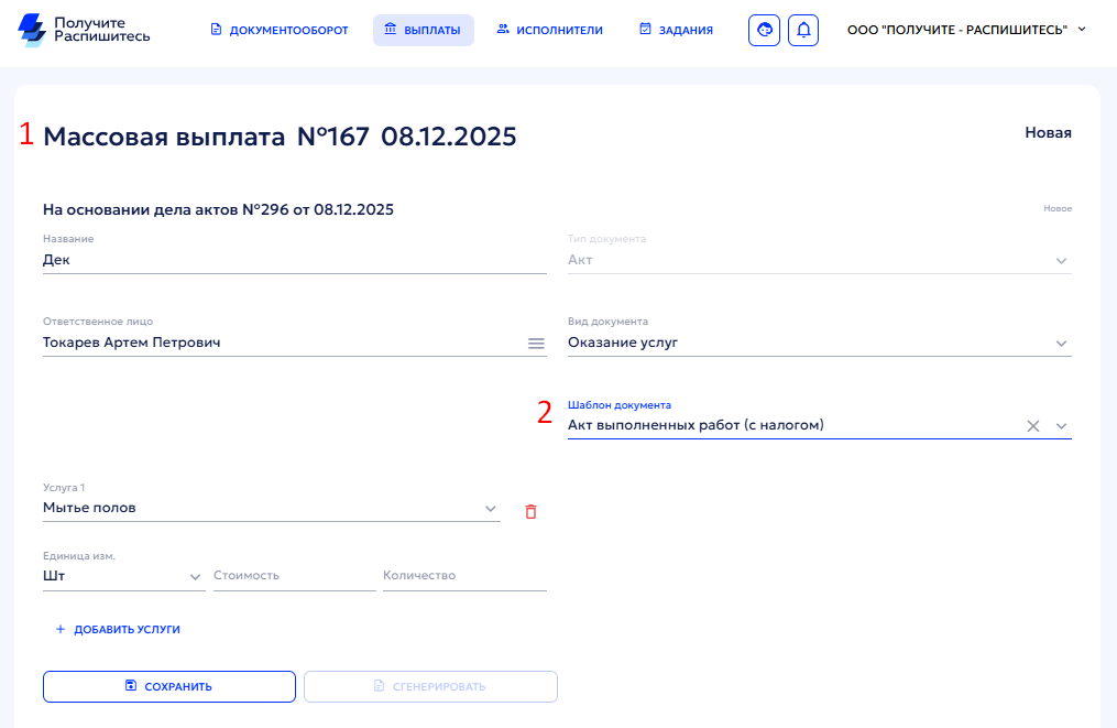 Создайте акт в разделе «Документооборот → Документы» либо на основании уже подписанного договора.