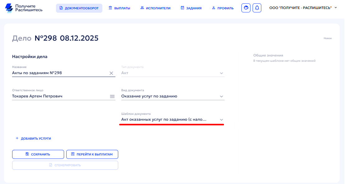 При заполнении «Дела актов» в поле «Шаблон документа» выберите «Акт выполненных работ (с налогом)».