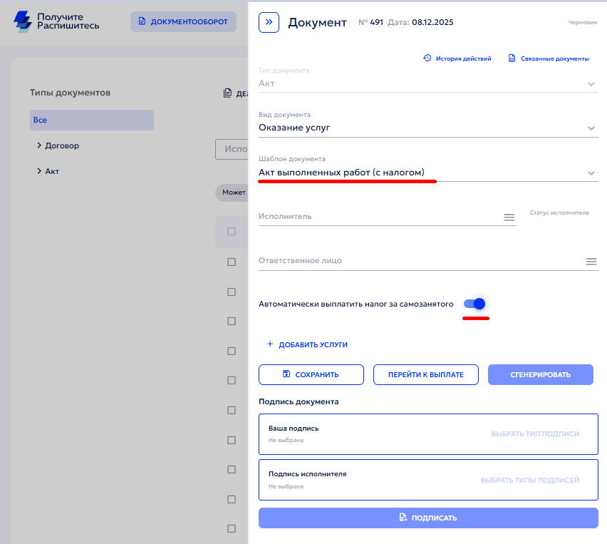 При заполнении поля «Шаблон документа» выберите «Акт выполненных работ (с налогом)» и активируйте опцию «Автоматически выплатить налог за самозанятого».