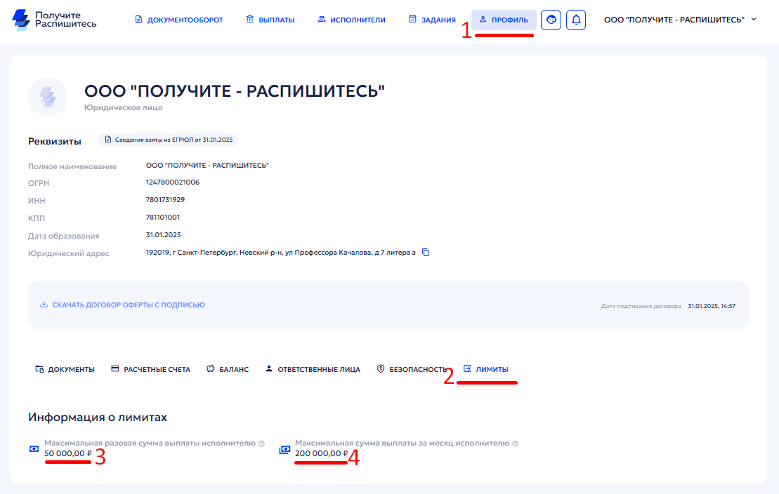 - Максимальная разовая сумма выплаты исполнителю (50 000 RUB)