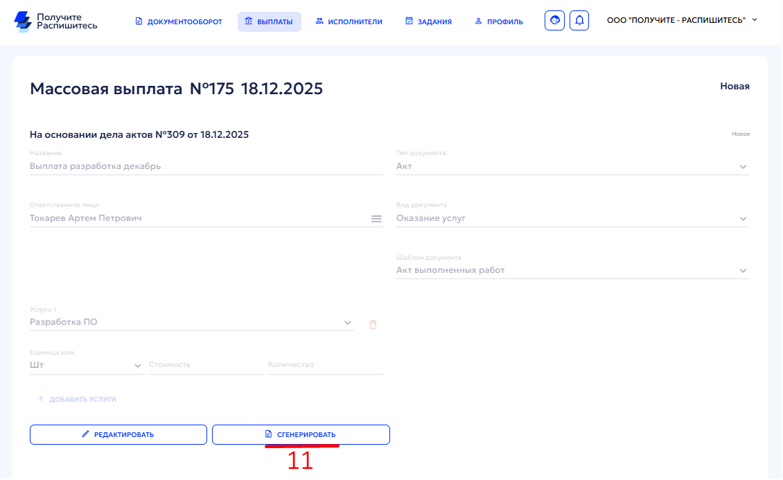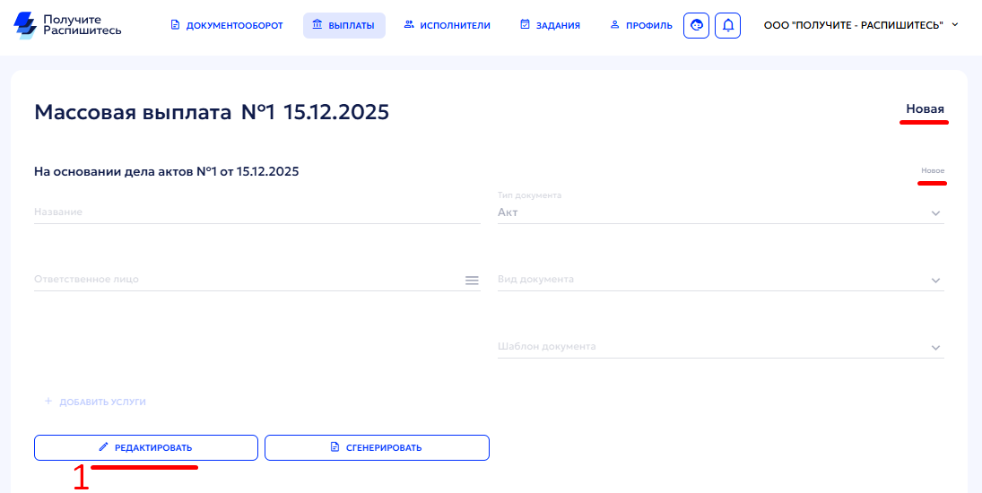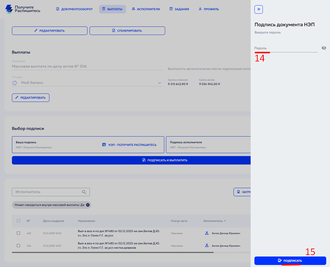 Если у Вас отключена автовыплата, то после подписания Акта выполненных работ со стороны исполнителя(ей) вы сможете выплатить массово или выборочно.