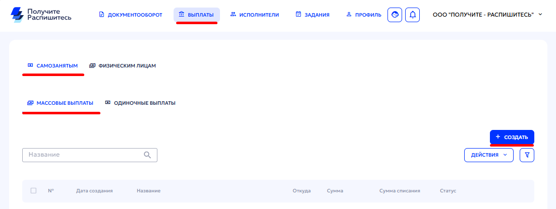 В разделе «Выплаты» выберите действие «Создать» в правой части экрана.