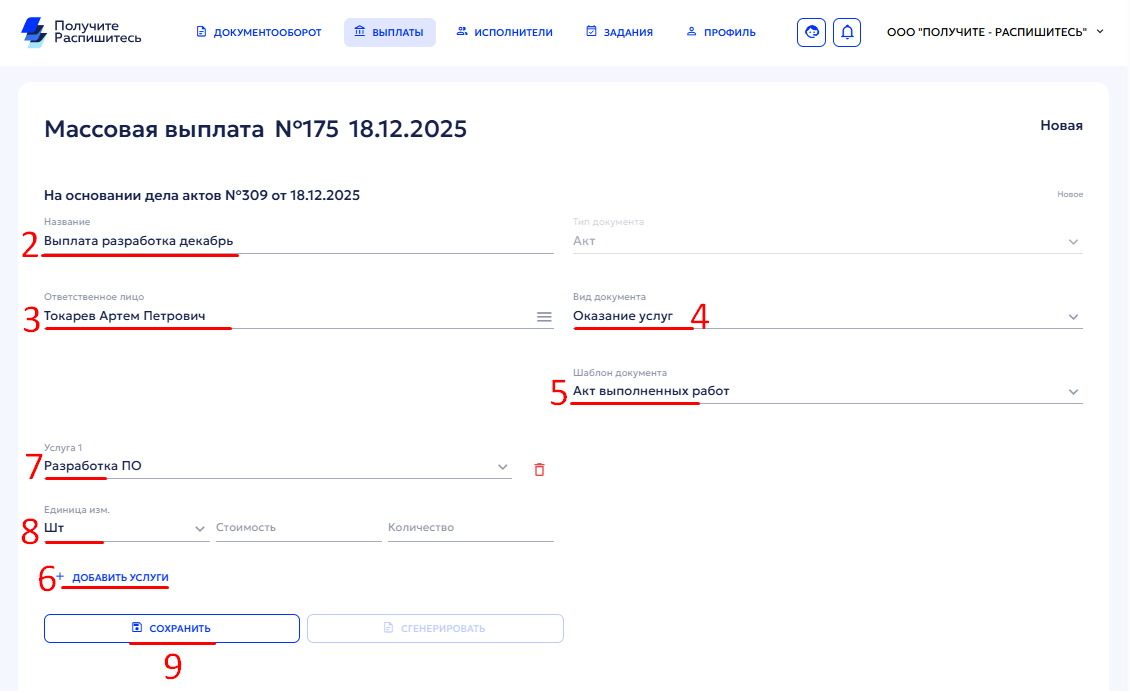 Стоимость и количество не заполняйте, если исполнители получают разные суммы — эти данные будут загружены позже через реестр.