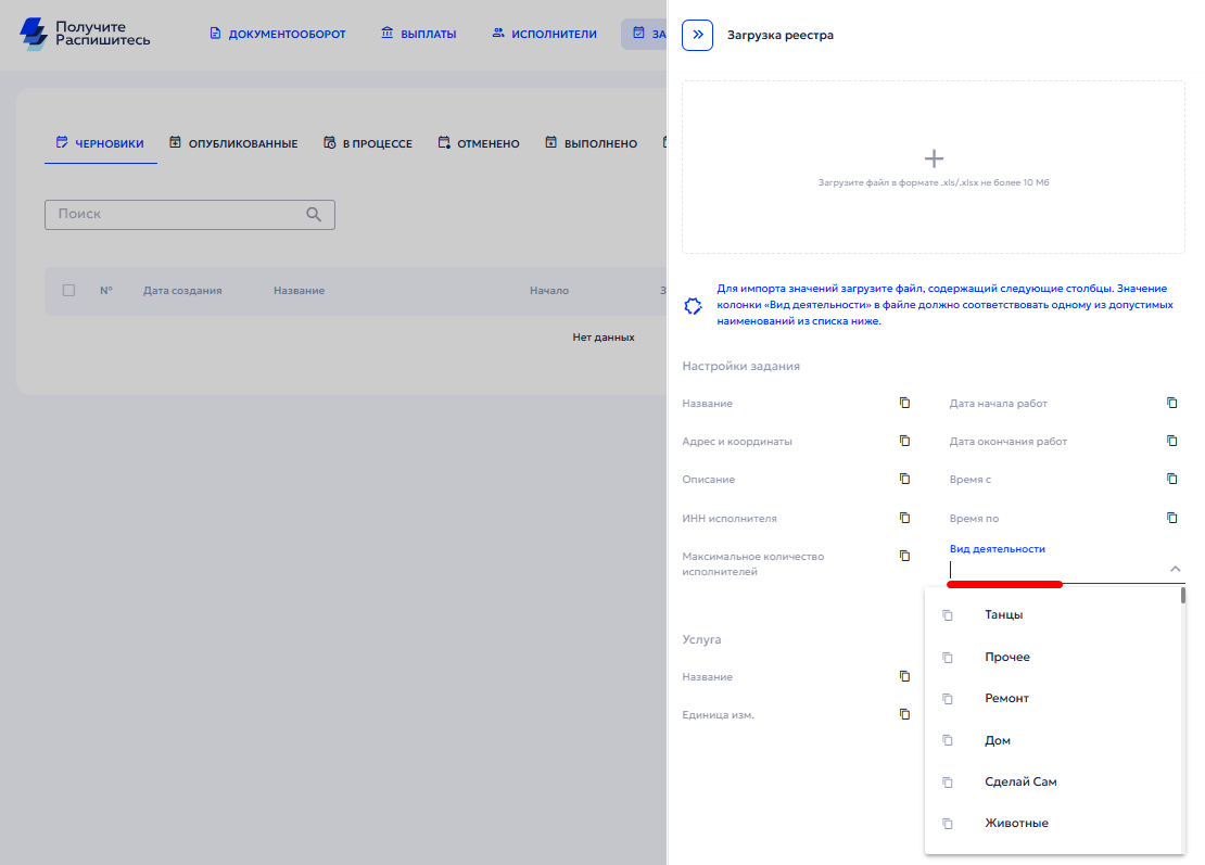 Виды деятельности для самозанятых ограничены в соответствии с требованиями законодательства и представлены на платформе из открытого справочника ФНС. Для работы через раздел «Задания» необходимо выбирать вид деятельности из доступного списка.